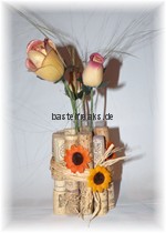 Vase aus Korken, mit Bast und Sonnenblumen verziert
